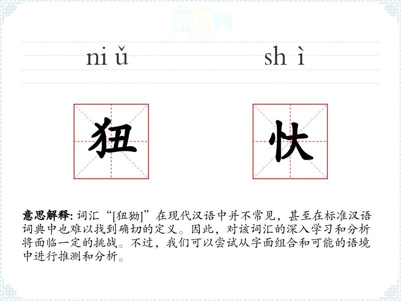 词汇“[狃狕]”在现代汉语中并不常见,甚至在标准汉语词典中也难以找到确切的定义。因此,对该词汇的深入学习和分析将面临一定的挑战。不过,我们可以尝试从字面组合和可能的语境中进行推测和分析。