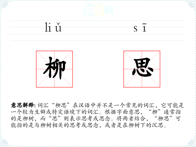 - 词源:“柳”源自柳树,“思”源自思考或思念。