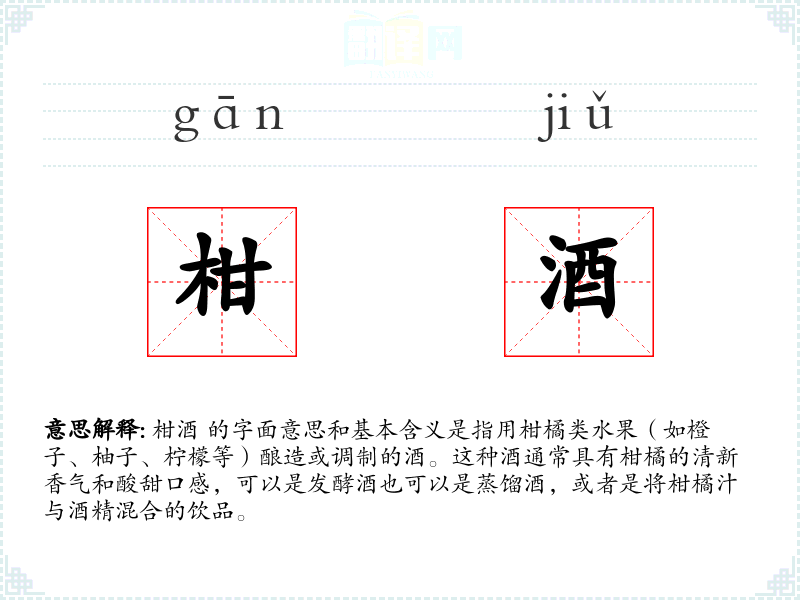 同义词:柑橘酒、橙酒、柚子酒 反义词:无直接反义词,但可以对比如“苦酒”或“烈酒”等口感或性质相反的酒类。