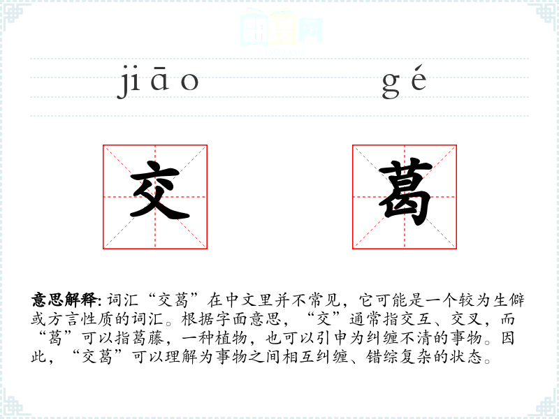 词汇“交葛”在中文里并不常见,它可能是一个较为生僻或方言性质的词汇。根据字面意思,“交”通常指交互、交叉,而“葛”可以指葛藤,一种植物,也可以引申为纠缠不清的事物。因此,“交葛”可以理解为事物之间相互纠缠、错综复杂的状态。