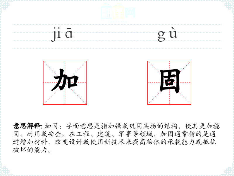 加固:字面意思是指加强或巩固某物的结构,使其更加稳固、耐用或安全。在工程、建筑、军事等领域,加固通常指的是通过增加材料、改变设计或使用新技术来提高物体的承载能力或抵抗破坏的能力。