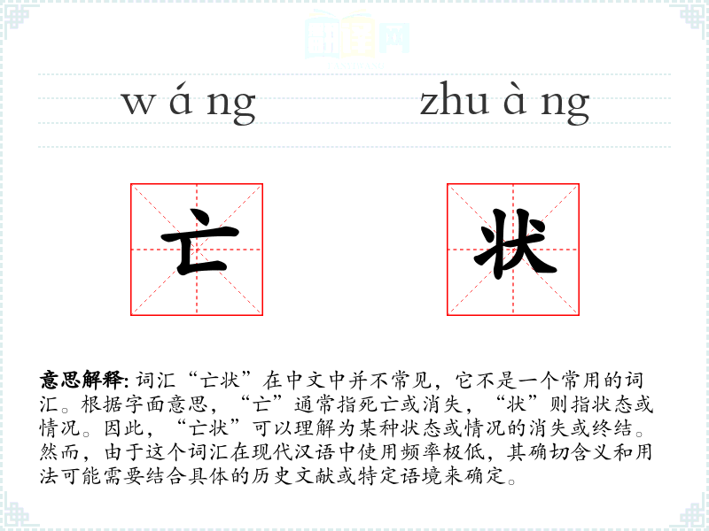 词汇“亡状”在中文中并不常见,它不是一个常用的词汇。根据字面意思,“亡”通常指死亡或消失,“状”则指状态或情况。因此,“亡状”可以理解为某种状态或情况的消失或终结。然而,由于这个词汇在现代汉语中使用频率极低,其确切含义和用法可能需要结合具体的历史文献或特定语境来确定。