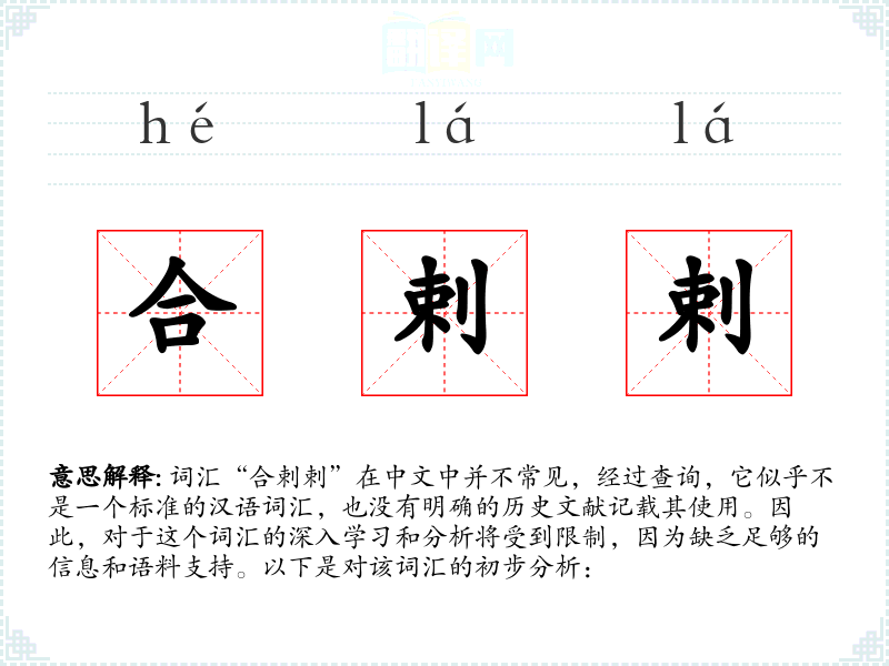 词汇“合剌剌”在中文中并不常见,经过查询,它似乎不是一个标准的汉语词汇,也没有明确的历史文献记载其使用。因此,对于这个词汇的深入学习和分析将受到限制,因为缺乏足够的信息和语料支持。以下是对该词汇的初步分析: