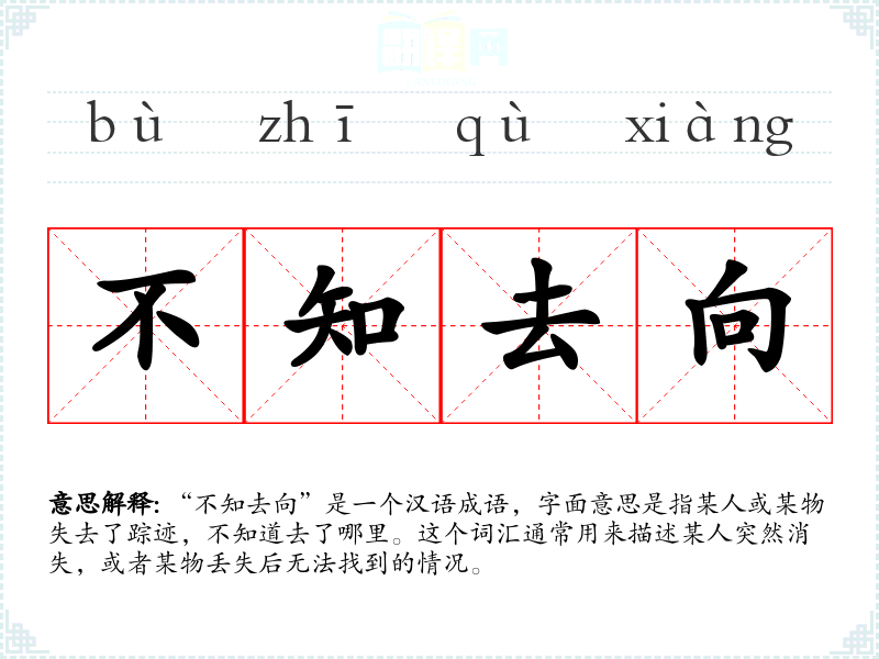 “不知去向”是一个汉语成语,字面意思是指某人或某物失去了踪迹,不知道去了哪里。这个词汇通常用来描述某人突然消失,或者某物丢失后无法找到的情况。