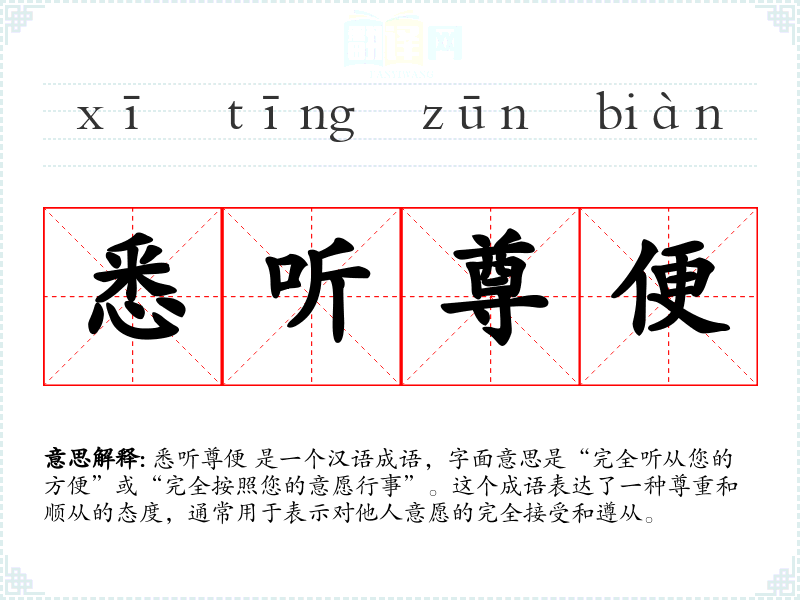 悉听尊便 是一个汉语成语,字面意思是“完全听从您的方便”或“完全按照您的意愿行事”。这个成语表达了一种尊重和顺从的态度,通常用于表示对他人意愿的完全接受和遵从。
