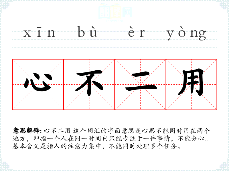 心不二用 这个词汇的字面意思是心思不能同时用在两个地方,即指一个人在同一时间内只能专注于一件事情,不能分心。基本含义是指人的注意力集中,不能同时处理多个任务。