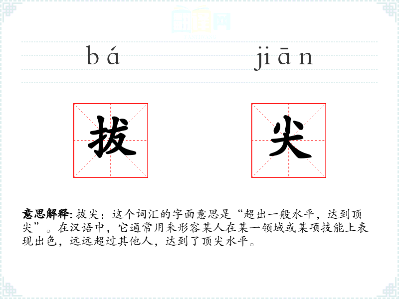 拔尖:这个词汇的字面意思是“超出一般水平,达到顶尖”。在汉语中,它通常用来形容某人在某一领域或某项技能上表现出色,远远超过其他人,达到了顶尖水平。