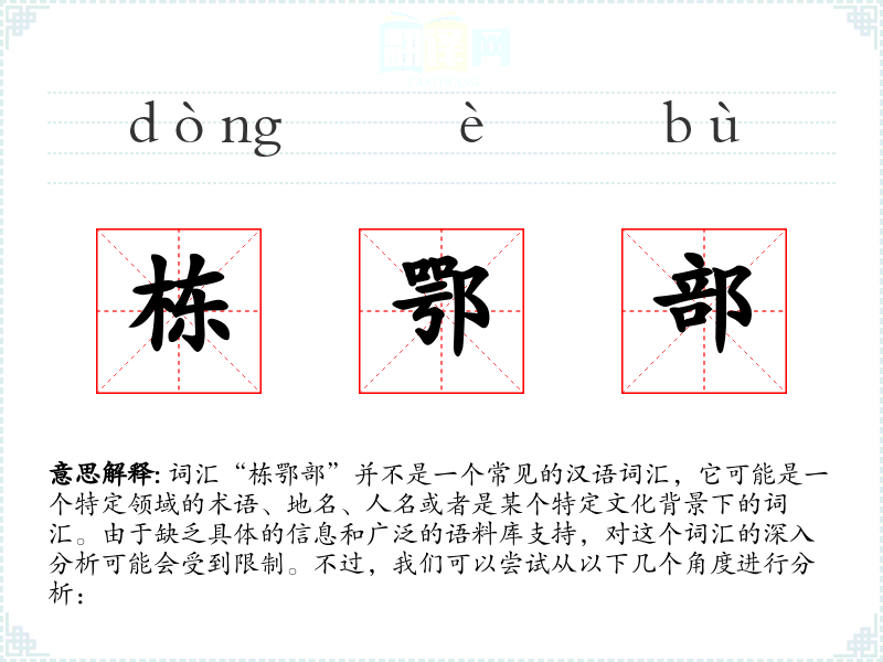 词汇“栋鄂部”并不是一个常见的汉语词汇,它可能是一个特定领域的术语、地名、人名或者是某个特定文化背景下的词汇。由于缺乏具体的信息和广泛的语料库支持,对这个词汇的深入分析可能会受到限制。不过,我们可以尝试从以下几个角度进行分析: