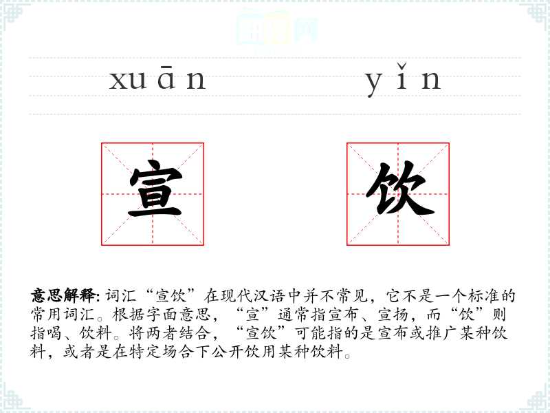 由于“宣饮”不是一个国际通用的词汇,它在不同语言或文化中的对应词汇可能不存在,或者需要根据具体语境进行翻译。