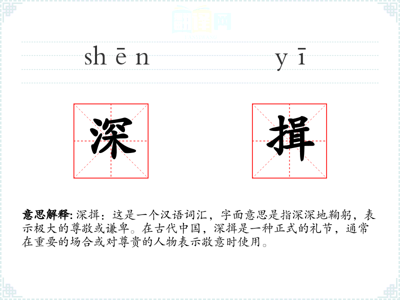 深揖:这是一个汉语词汇,字面意思是指深深地鞠躬,表示极大的尊敬或谦卑。在古代**,深揖是一种正式的礼节,通常在重要的场合或对尊贵的人物表示敬意时使用。