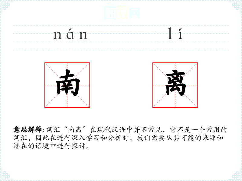 由于“南离”不是一个常用词汇,它在文学、口语或专业领域中的使用非常有限。可能在一些古文或特定文学作品中出现,用以表达某种特定的情感或场景。