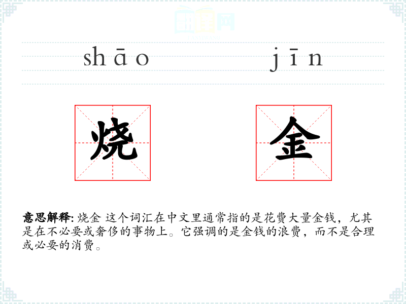 “烧金”这个词汇可能是由“烧钱”演变而来,强调金钱像被烧掉一样迅速消失,形象地描述了金钱的浪费。