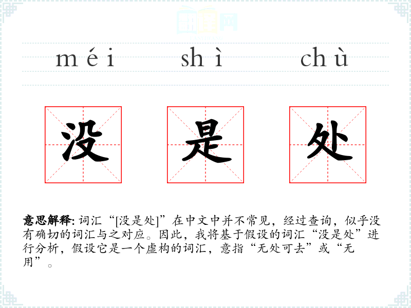 词汇“[没是处]”在中文中并不常见,经过查询,似乎没有确切的词汇与之对应。因此,我将基于假设的词汇“没是处”进行分析,假设它是一个虚构的词汇,意指“无处可去”或“无用”。