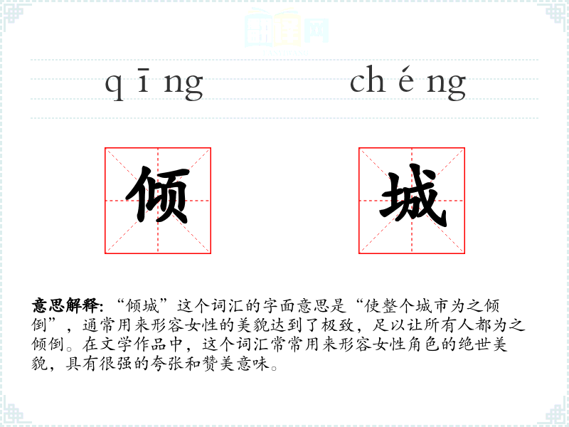 “倾城”这个词汇的字面意思是“使整个城市为之倾倒”,通常用来形容女性的美貌达到了极致,足以让所有人都为之倾倒。在文学作品中,这个词汇常常用来形容女性角色的绝世美貌,具有很强的夸张和赞美意味。