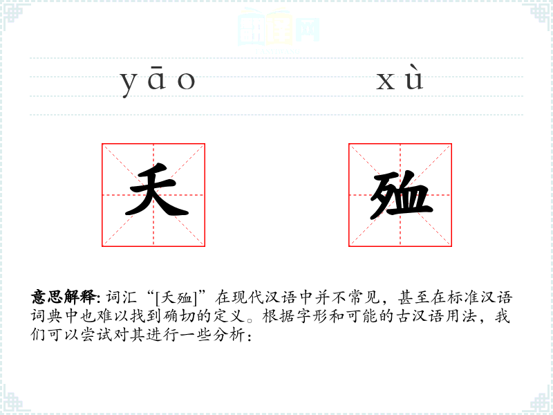 词汇“[夭殈]”在现代汉语中并不常见,甚至在标准汉语词典中也难以找到确切的定义。根据字形和可能的古汉语用法,我们可以尝试对其进行一些分析: