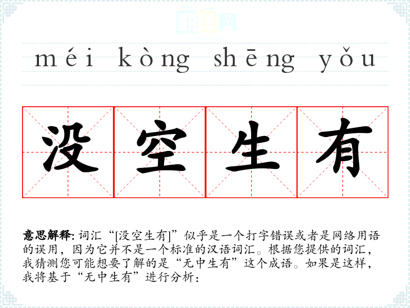 词汇“[没空生有]”似乎是一个打字错误或者是网络用语的误用,因为它并不是一个标准的汉语词汇。根据您提供的词汇,我猜测您可能想要了解的是“无中生有”这个成语。如果是这样,我将基于“无中生有”进行分析: