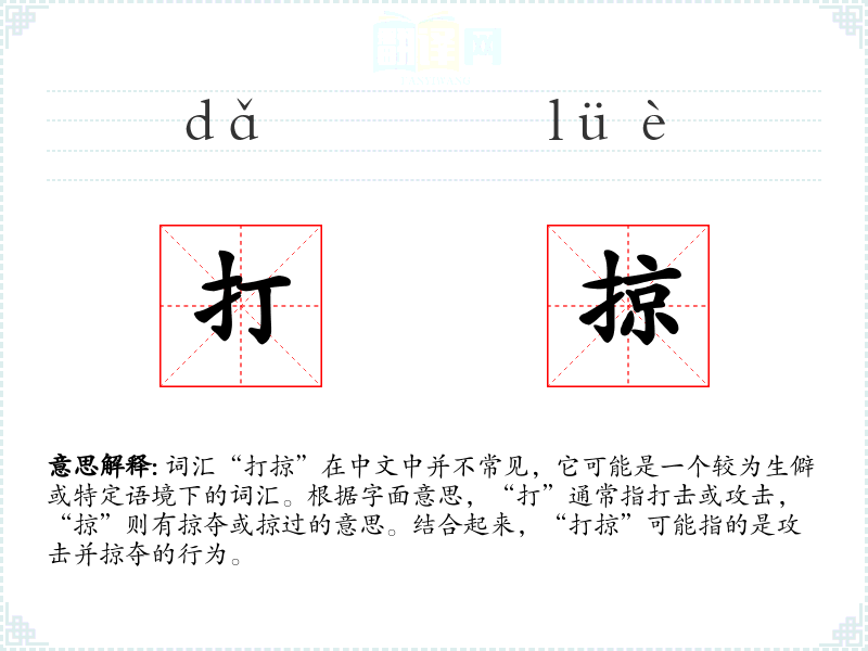 词汇“打掠”在中文中并不常见,它可能是一个较为生僻或特定语境下的词汇。根据字面意思,“打”通常指打击或攻击,“掠”则有掠夺或掠过的意思。结合起来,“打掠”可能指的是攻击并掠夺的行为。