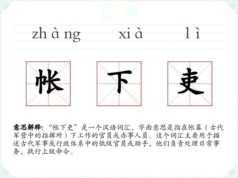 “帐下吏”是一个汉语词汇,字面意思是指在帐幕(古代军营中的指挥所)下工作的官员或办事人员。这个词汇主要用于描述古代军事或行政体系中的低级官员或助手,他们负责处理日常事务,执行上级命令。