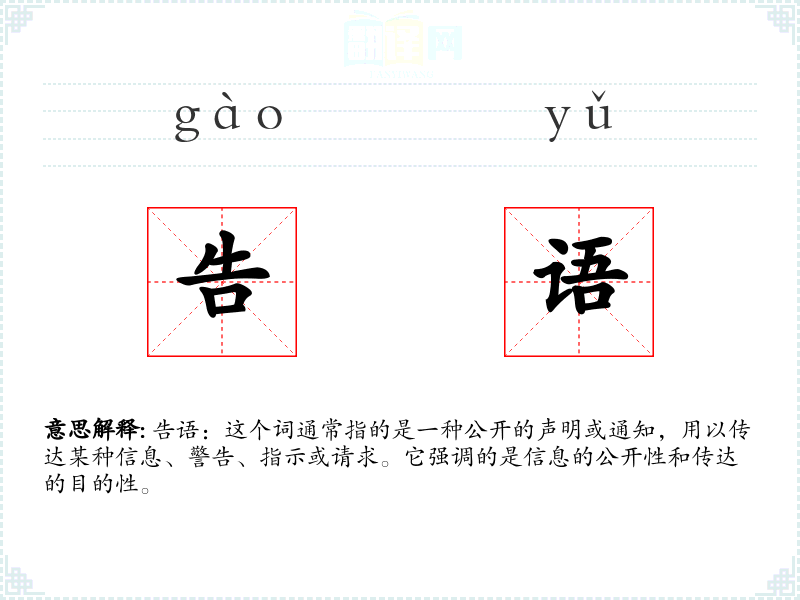 告语:这个词通常指的是一种公开的声明或通知,用以传达某种信息、警告、指示或请求。它强调的是信息的公开性和传达的目的性。