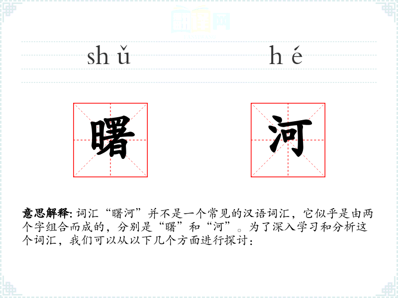词汇“曙河”并不是一个常见的汉语词汇,它似乎是由两个字组合而成的,分别是“曙”和“河”。为了深入学习和分析这个词汇,我们可以从以下几个方面进行探讨: