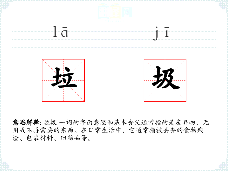 垃圾 一词的字面意思和基本含义通常指的是废弃物、无用或不再需要的东西。在日常生活中,它通常指被丢弃的食物残渣、包装材料、旧物品等。
