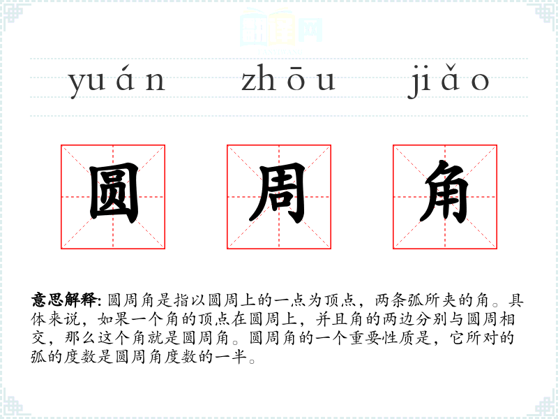 - 反义词:中心角(中心角是指以圆心为顶点的角,与圆周角不同)