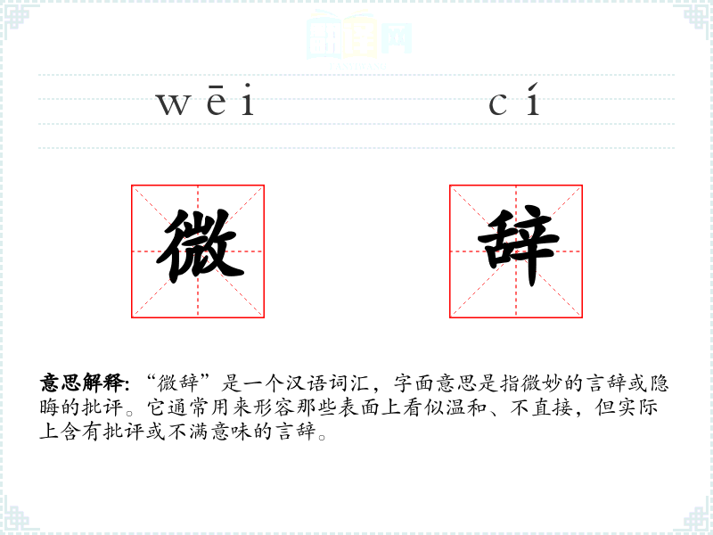 “微辞”是一个汉语词汇,字面意思是指微妙的言辞或隐晦的批评。它通常用来形容那些表面上看似温和、不直接,但实际上含有批评或不满意味的言辞。