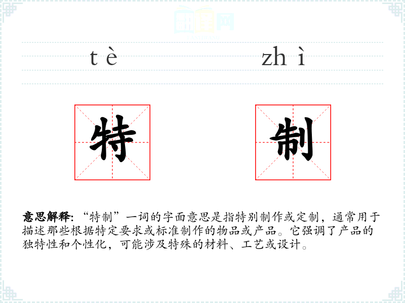 “特制”一词的字面意思是指特别制作或定制,通常用于描述那些根据特定要求或标准制作的物品或产品。它强调了产品的独特性和个性化,可能涉及特殊的材料、工艺或设计。