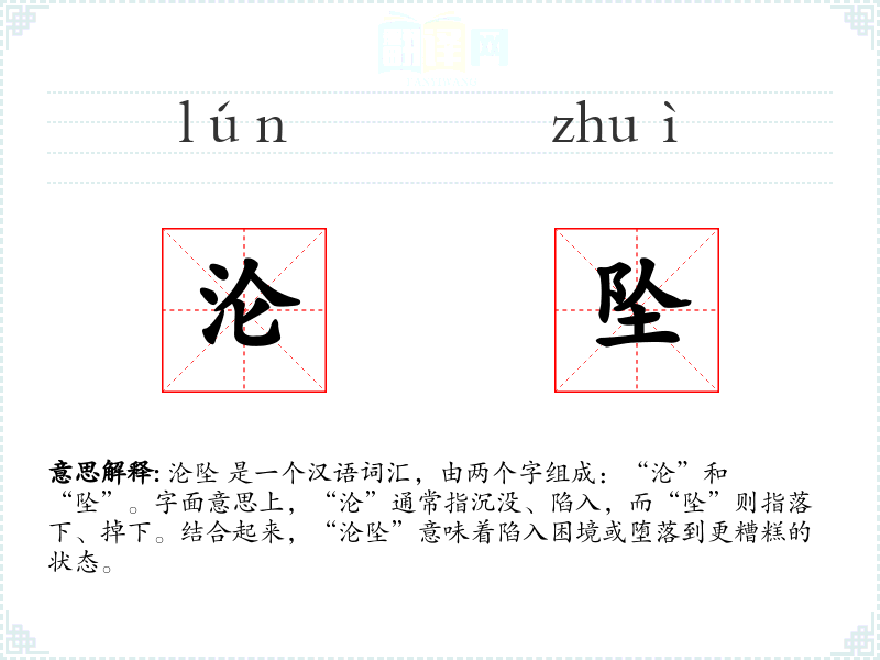 “沦”字最早见于《说文解字》,原意为水流环绕,后引申为陷入。“坠”字则源于古代的“坠”,意为从高处落下。两个字结合后,形成了描述负面状态的词汇。