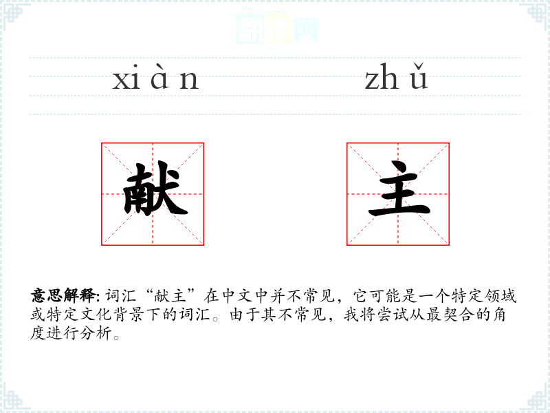 词汇“献主”在中文中并不常见,它可能是一个特定领域或特定文化背景下的词汇。由于其不常见,我将尝试从最契合的角度进行分析。