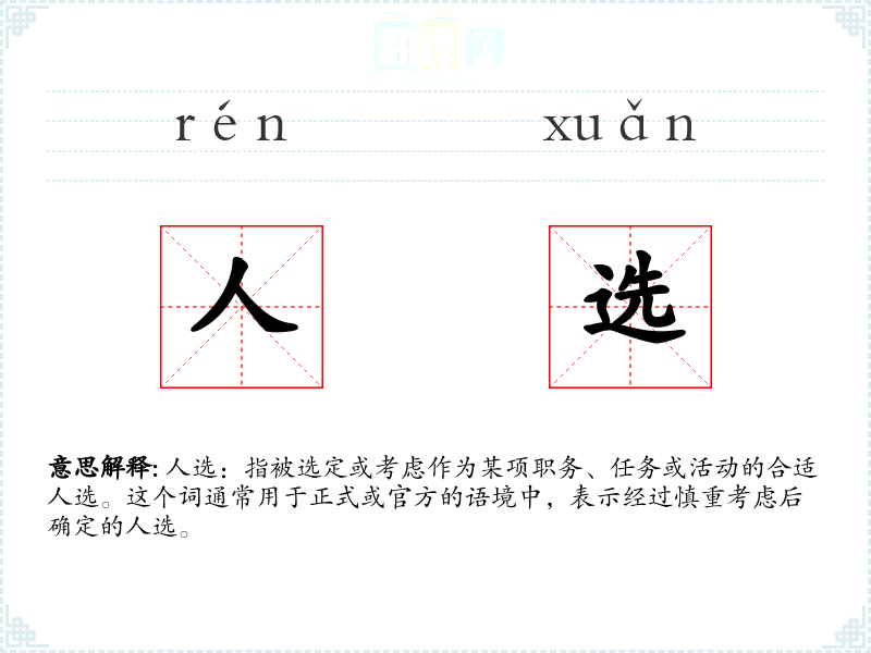 人选:指被选定或考虑作为某项职务、任务或活动的合适人选。这个词通常用于正式或官方的语境中,表示经过慎重考虑后确定的人选。