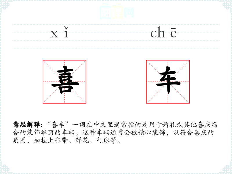 - 反义词:灵车(用于葬礼的车辆,与喜庆场合的喜车形成鲜明对比)