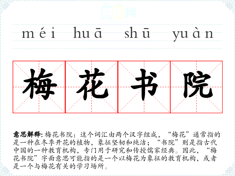 梅花书院:这个词汇由两个汉字组成,“梅花”通常指的是一种在冬季开花的植物,象征坚韧和纯洁;“书院”则是指古代*的一种教育机构,专门用于研究和传授儒家经典。因此,“梅花书院”字面意思可能指的是一个以梅花为象征的教育机构,或者是一个与梅花有关的学场所。