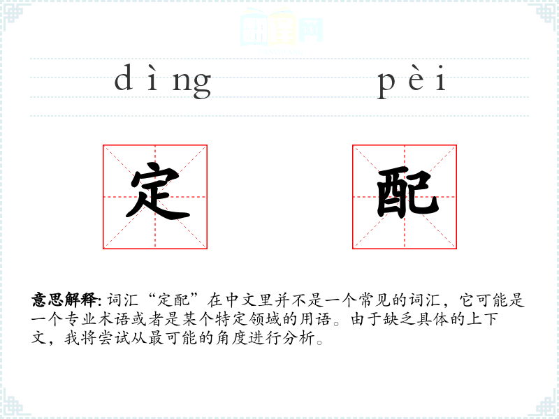 词汇“定配”在中文里并不是一个常见的词汇,它可能是一个专业术语或者是某个特定领域的用语。由于缺乏具体的上下文,我将尝试从最可能的角度进行分析。