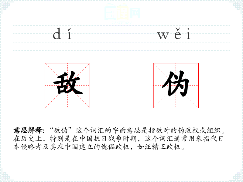 “敌伪”这个词汇的字面意思是指敌对的伪政权或组织。在历史上,特别是在抗日战争时期,这个词汇通常用来指代日本侵略者及其在建立的傀儡政权,如***政权。
