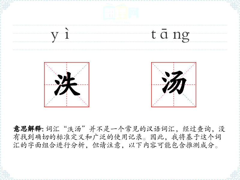 对于“泆汤”这个词汇的理解,由于缺乏广泛的使用和定义,我们只能基于字面意思进行推测。在语言学习和表达中,了解和掌握常用词汇更为重要,而这类非常用词汇的学习可能更多地依赖于特定的文化背景和语境。
