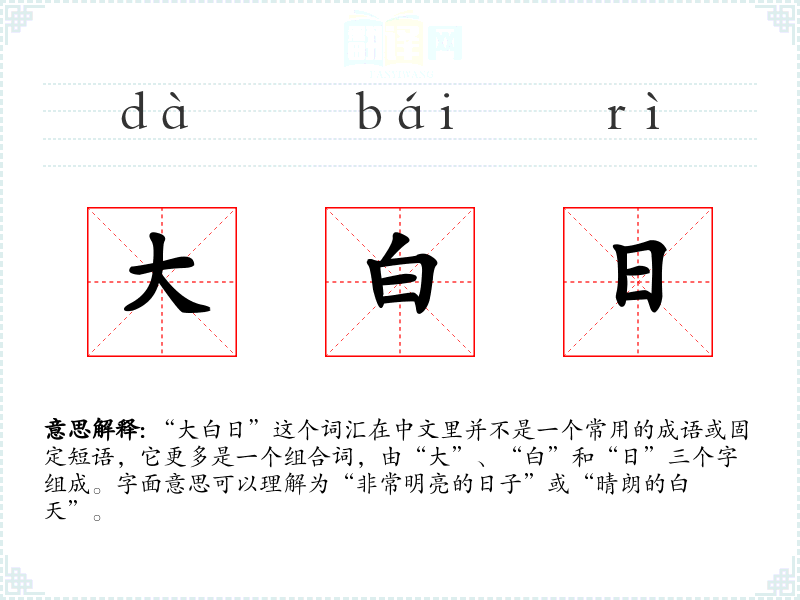 “大白日”这个词汇在中文里并不是一个常用的成语或固定短语,它更多是一个组合词,由“大”、“白”和“日”三个字组成。字面意思可以理解为“非常明亮的日子”或“晴朗的白天”。