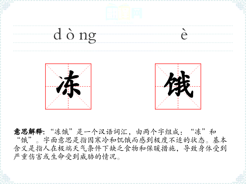 “冻”字在古代汉语中已有冻结、寒冷的意思,“饿”字则指饥饿。两个字组合在一起,形成了描述极端生存条件的词汇。随着社会的发展,这个词的使用范围和含义也有所扩展,不仅仅局限于字面意义,还包含了更深层次的社会和文化意义。