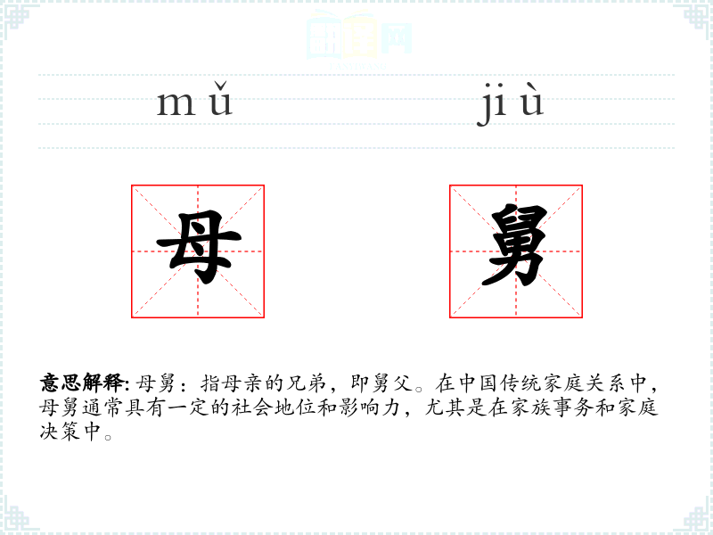 母舅:指母亲的兄弟,即舅父。在**传统家庭关系中,母舅通常具有一定的社会地位和影响力,尤其是在家族事务和家庭决策中。