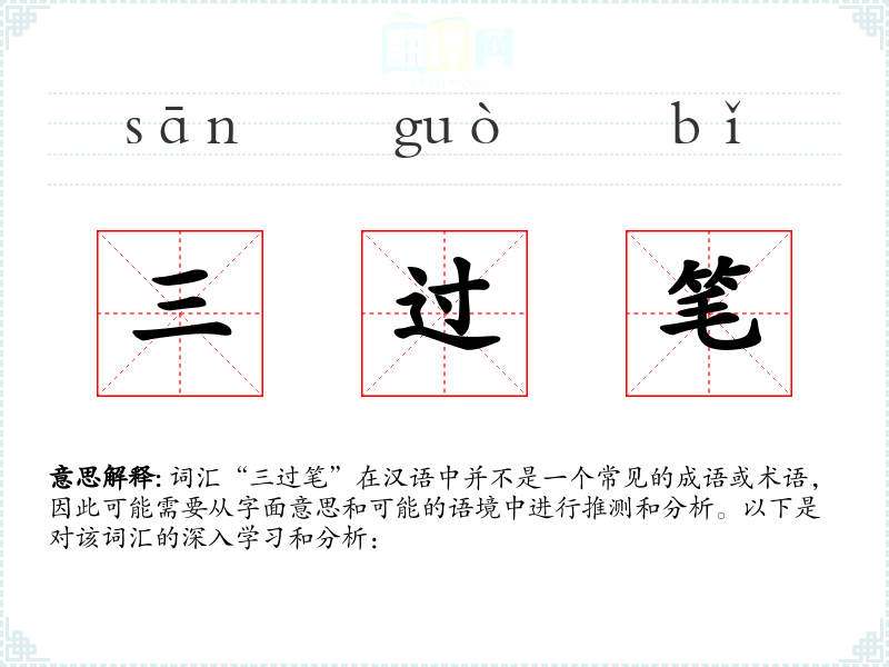 词汇“三过笔”在汉语中并不是一个常见的成语或术语,因此可能需要从字面意思和可能的语境中进行推测和分析。以下是对该词汇的深入学习和分析:
