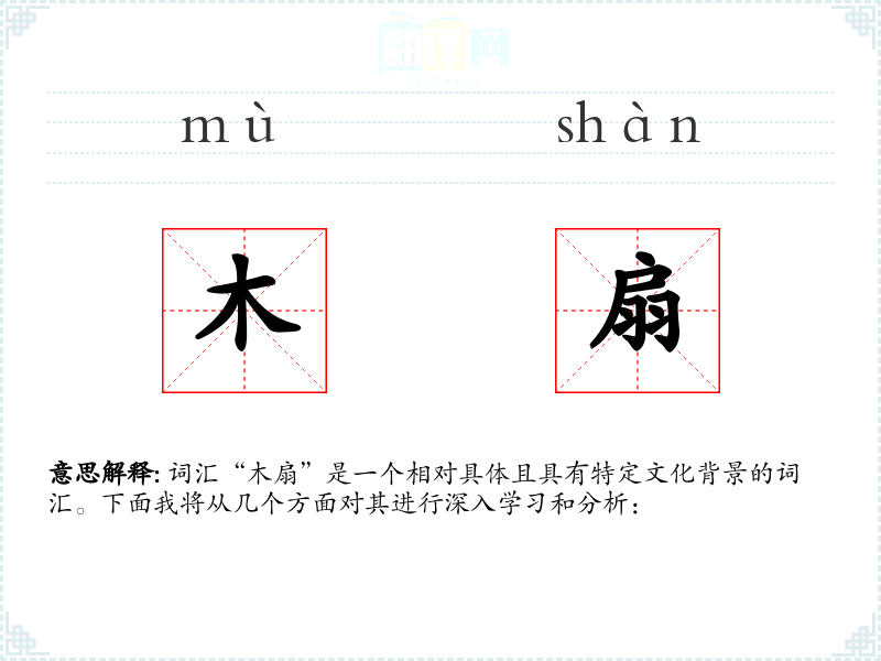 词汇“木扇”是一个相对具体且具有特定文化背景的词汇。下面我将从几个方面对其进行深入学*和分析: