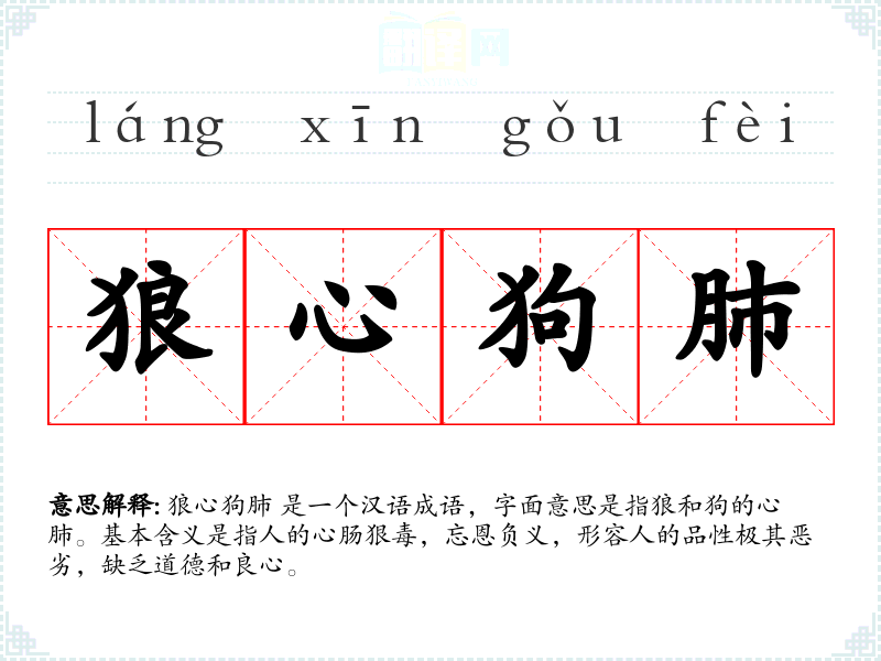 狼心狗肺 是一个汉语成语,字面意思是指狼和狗的心肺。基本含义是指人的心肠狠毒,忘恩负义,形容人的品性极其恶劣,缺乏道德和良心。