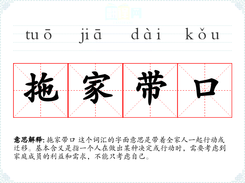 这个词汇的词源较为直接,由“拖”和“家”以及“带”和“口”组成,形象地描述了带着家人一起行动的情景。在现代汉语中,这个词汇的使用频率较高,尤其是在讨论家庭决策和个人选择时。