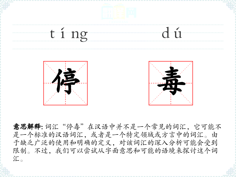 词汇“停毒”在汉语中并不是一个常见的词汇,它可能不是一个标准的汉语词汇,或者是一个特定领域或方言中的词汇。由于缺乏广泛的使用和明确的定义,对该词汇的深入分析可能会受到限制。不过,我们可以尝试从字面意思和可能的语境来探讨这个词汇。