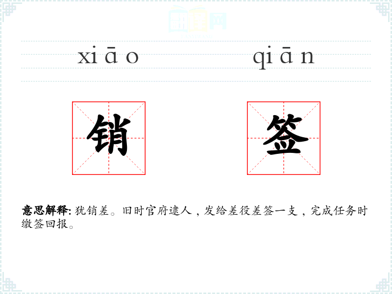 犹销差。旧时官府逮人﹐发给差役差签一支﹐完成任务时缴签回报。