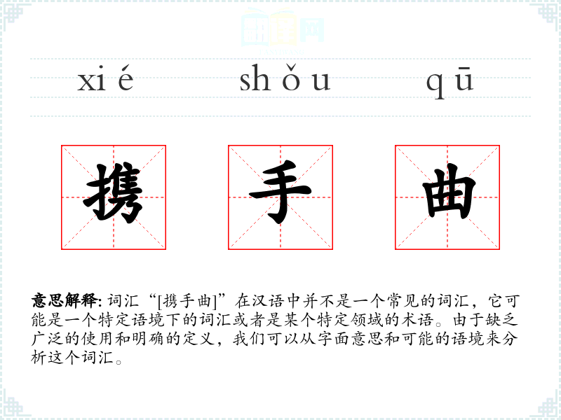 - 由于“携手曲”不是一个常用词汇,其词源和演变可能不明确,可能是一个现代创造的词汇,用于特定的文化或社会活动。
