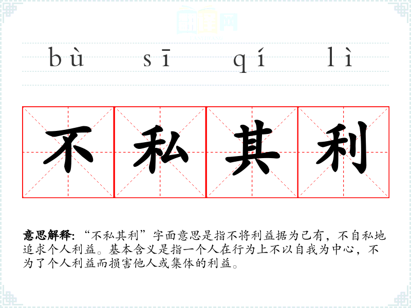 “不私其利”字面意思是指不将利益据为己有,不自私地追求个人利益。基本含义是指一个人在行为上不以自我为中心,不为了个人利益而损害他人或集体的利益。