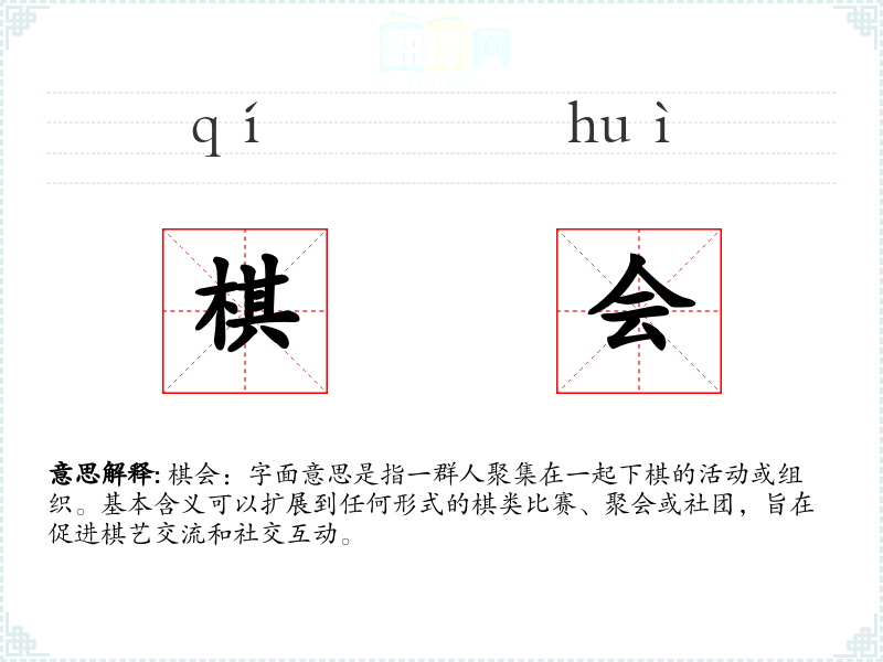 棋会:字面意思是指一群人聚集在一起下棋的活动或组织。基本含义可以扩展到任何形式的棋类比赛、聚会或社团,旨在促进棋艺交流和社交互动。