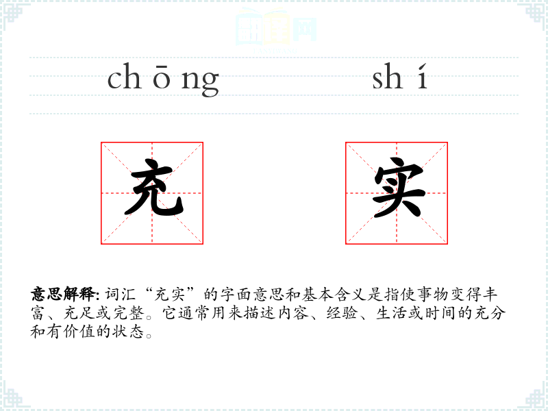 词汇“充实”的字面意思和基本含义是指使事物变得丰富、充足或完整。它通常用来描述内容、经验、生活或时间的充分和有价值的状态。