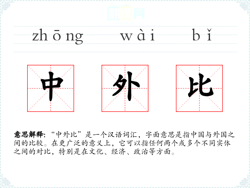 “中外比”是一个汉语词汇,字面意思是指**与外国之间的比较。在更广泛的意义上,它可以指任何两个或多个不同实体之间的对比,特别是在文化、经济、政治等方面。
